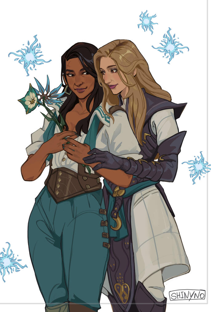 HalfBody+ Extra character, Lineart+FlatColor, with extra shading+ extra minor object (wisps)